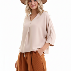 V Yaka Katlamalı Uzun Kol Göğüs Kat Detaylı Önü Kısa Arkası Uzun Geniş Rahat Kesim Şık Ve Cool Bluz