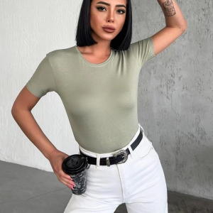 Rahat Ve Şık Kısa Kollu Bisiklet Yaka Likralı Viskon Penye Body Haki